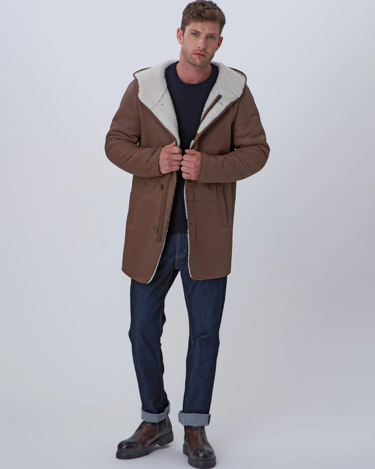 Mens shearling lamb coat with hood.