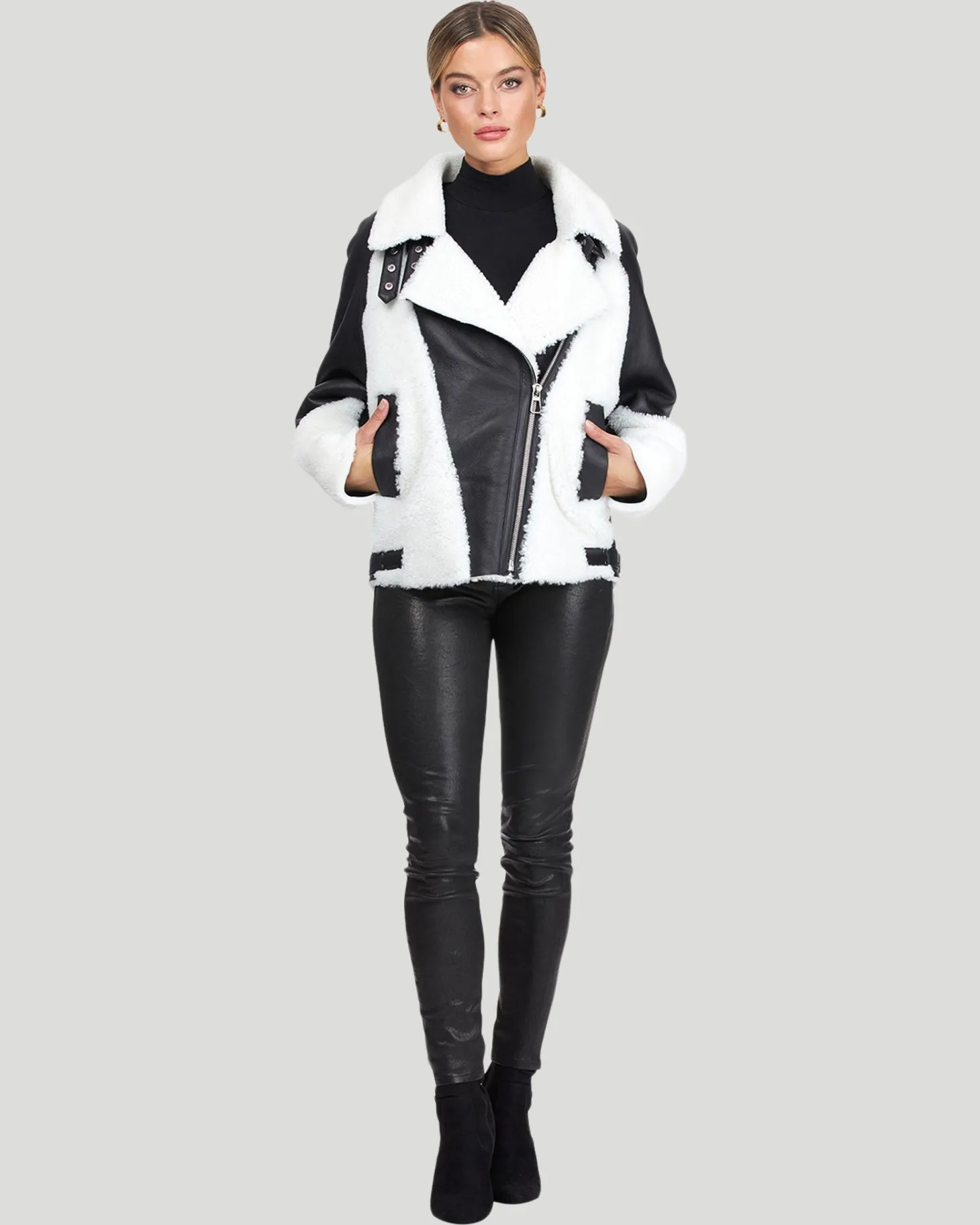 This 24″ shearling moto zip jacket is a fashion favorite. The boxy silhouette is paired with an asymmetrical zipper and black/white color contrast for an effortlessly cool look.